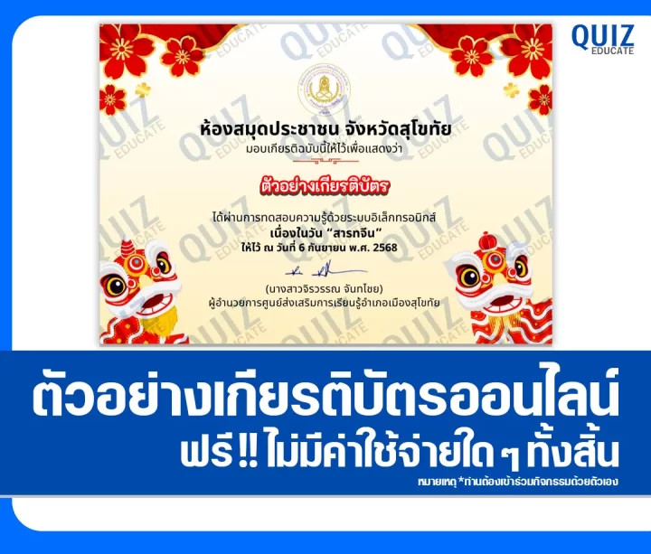 สวัสดีครับ วันนี้ผมขอนำกิจกรรมการทำข้อสอบวัดระดับความรู้ เรื่อง วันสารทจีน เพื่อรับเกียรติบัตรออนไลน์ ผ่าน Google Form โดยเมื่อท่านได้ทำแบบทดสอบผ่านเกณฑ์ที่ทางผู้จัดกิจกรรมได้กำหนดไว้ ท่านจะได้รับเกียรติบัตรเป็นไฟล์ PDF ดังภาพตัวอย่างที่ได้ทางผมได้นำมาแสดงให้ดูไว้ผ่านทาง Email ที่ท่านได้ลงทะเบียนไว้ตอนทำแบบทดสอบ หรือ Platform ค้นหาเกียรติบัตร(จะมีปุ่มค้นหาให้ดาวน์โหลดอยู่ข้างๆกัน)ครับ สามารถทำแบบทดสอบได้ที่ลิงก์ทำแบบทดสอบด้านล่างเลยครับ