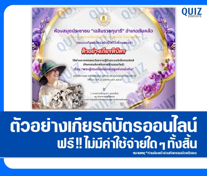 เกียรติบัตรออนไลน์ฟรี ทำข้อสอบวัดระดับความรู้ เรื่อง พระผู้ทรงเป็นแม่และครูแห่งแผ่นดิน