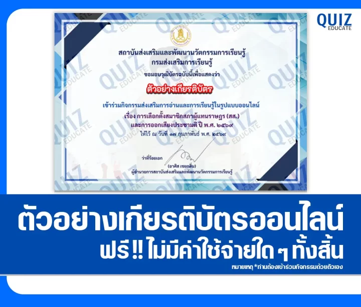 สวัสดีครับ วันนี้ผมขอนำกิจกรรมทำข้อสอบวัดระดับความรู้ เรื่อง การเลือกตั้งสมาชิกสภาผู้แทนราษฎร (สส.) และการออกเสียงประชามติ ปี พ.ศ. 2569 เพื่อรับเกียรติบัตรออนไลน์ โดยเมื่อท่านได้ทำแบบทดสอบผ่านเกณฑ์ที่ทางผู้จัดกิจกรรมได้กำหนดไว้ ท่านจะได้รับเกียรติบัตรเป็นไฟล์ PDF ดังภาพตัวอย่างที่ได้ทางผมได้นำมาแสดงให้ดูไว้ผ่านทาง Email ที่ท่านได้ลงทะเบียนไว้ตอนทำแบบทดสอบ หรือ Platform ค้นหาเกียรติบัตร(จะมีปุ่มค้นหาอยู่ข้างๆกัน)ครับ สามารถทำแบบทดสอบได้ที่ปุ่มทำแบบทดสอบด้านล่างเลยครับ