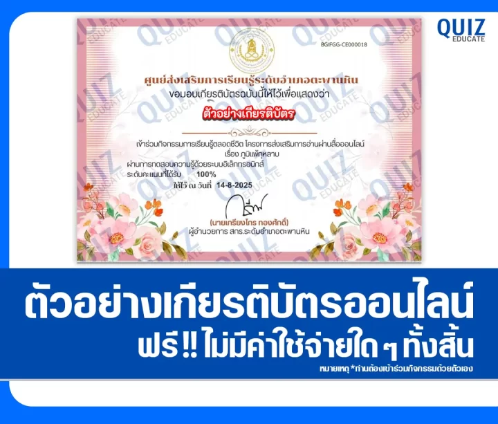 สวัสดีครับ วันนี้ผมขอนำกิจกรรมการทำข้อสอบวัดระดับความรู้ เรื่อง โรคภูมิแพ้กุหลาบ เพื่อรับเกียรติบัตรออนไลน์ ผ่าน Google Form โดยเมื่อท่านได้ทำแบบทดสอบผ่านเกณฑ์ที่ทางผู้จัดกิจกรรมได้กำหนดไว้ ท่านจะได้รับเกียรติบัตรเป็นไฟล์ PDF ดังภาพตัวอย่างที่ได้ทางผมได้นำมาแสดงให้ดูไว้ผ่านทาง Email ที่ท่านได้ลงทะเบียนไว้ตอนทำแบบทดสอบ หรือ Platform ค้นหาเกียรติบัตร(จะมีปุ่มค้นหาอยู่ข้างๆกัน)ครับ สามารถทำแบบทดสอบได้ที่ปุ่มทำแบบทดสอบด้านล่างเลยครับ