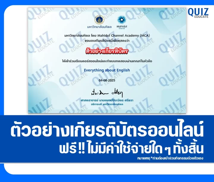 ทำข้อสอบวัดระดับความรู้ เรื่อง Everything about English เพื่อรับเกียรติบัตรออนไลน์ จาก มหาวิทยาลัยมหิดล