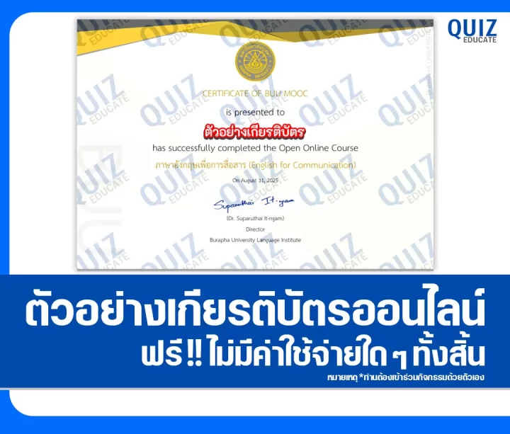 สวัสดีครับ วันนี้ผมขอนำกิจกรรมการทำข้อสอบวัดระดับความรู้ เรื่อง ภาษาอังกฤษเพื่อการสื่อสาร English for Communication เพื่อรับเกียรติบัตรออนไลน์ จาก มหาวิทยาลัยบูรพา โดยเมื่อท่านได้ทำแบบทดสอบผ่านเกณฑ์ที่ทางผู้จัดกิจกรรมได้กำหนดไว้ ท่านจะได้รับเกียรติบัตรเป็นไฟล์ PDF ดังภาพตัวอย่างที่ได้ทางผมได้นำมาแสดงให้ดูไว้ผ่านทาง Email หรือ Platform ที่ท่านได้ลงทะเบียนไว้ตอนทำแบบทดสอบครับ สามารถทำแบบทดสอบได้ที่ปุ่มทำแบบทดสอบด้านล่างเลยครับ