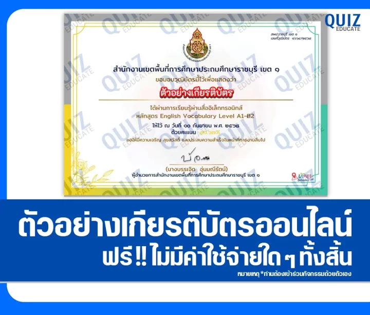 สวัสดีครับ วันนี้ผมขอนำกิจกรรมการทำข้อสอบวัดระดับความรู้ เรื่อง English Vocabulary Level A1-B2 เพื่อรับเกียรติบัตรออนไลน์ ผ่าน Google form โดยเมื่อท่านได้ทำแบบทดสอบผ่านเกณฑ์ที่ทางผู้จัดกิจกรรมได้กำหนดไว้ ท่านจะได้รับเกียรติบัตรเป็นไฟล์ PDF ดังภาพตัวอย่างที่ได้ทางผมได้นำมาแสดงให้ดูไว้ผ่านทาง Email หรือ Platform ที่ท่านได้ลงทะเบียนไว้ตอนทำแบบทดสอบครับ สามารถทำแบบทดสอบได้ที่ปุ่มทำแบบทดสอบด้านล่างเลยครับ