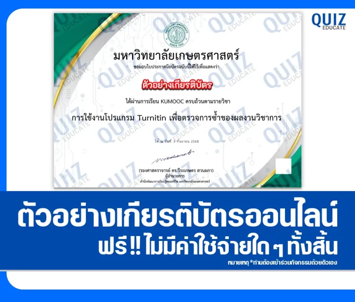 ทำข้อสอบวัดระดับความรู้ เรื่อง การใช้งานโปรแกรม Turnitin เพื่อตรวจการซ้ำของผลงานวิชาการ เพื่อรับเกียรติบัตรออนไลน์ จาก มหาวิทยาลัยเกษตรศาสตร์