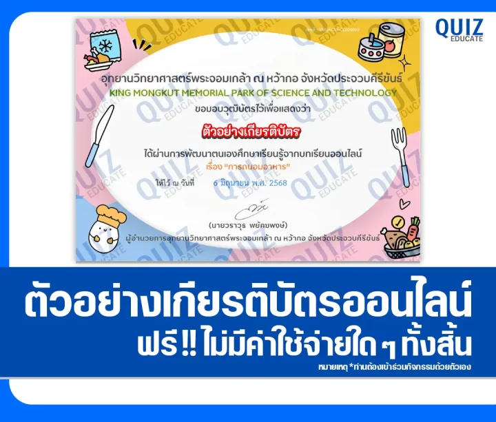 สวัสดีครับ วันนี้ผมขอนำกิจกรรมการทำข้อสอบวัดระดับความรู้ เรื่อง การถนอมอาหาร เพื่อรับเกียรติบัตรออนไลน์ ผ่าน Google Form โดยเมื่อท่านได้ทำแบบทดสอบผ่านเกณฑ์ที่ทางผู้จัดกิจกรรมได้กำหนดไว้ ท่านจะได้รับเกียรติบัตรเป็นไฟล์ PDF ดังภาพตัวอย่างที่ได้ทางผมได้นำมาแสดงให้ดูไว้ผ่านทาง Email ที่ท่านได้ลงทะเบียนไว้ตอนทำแบบทดสอบ หรือ Platform ค้นหาเกียรติบัตร(จะมีปุ่มค้นหาอยู่ข้างๆกัน)ครับ สามารถทำแบบทดสอบได้ที่ปุ่มทำแบบทดสอบด้านล่างเลยครับ