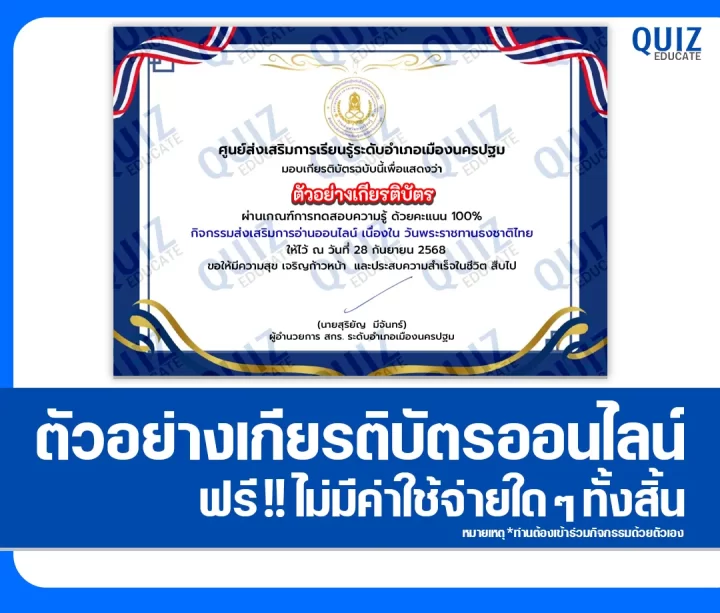 สวัสดีครับ วันนี้ผมขอนำกิจกรรมทำข้อสอบวัดระดับความรู้ เรื่อง วันพระราชทานธงชาติไทย เพื่อรับเกียรติบัตรออนไลน์โดย สถาบันเสริมศึกษาและทรัพยากรมนุษย์ มหาวิทยาลัยธรรมศาสตร์ โดยเมื่อท่านได้ทำแบบทดสอบผ่านเกณฑ์ที่ทางผู้จัดกิจกรรมได้กำหนดไว้ ท่านจะได้รับเกียรติบัตรเป็นไฟล์ PDF ดังภาพตัวอย่างที่ได้ทางผมได้นำมาแสดงให้ดูไว้ผ่านทาง Email ที่ท่านได้ลงทะเบียนไว้ตอนทำแบบทดสอบ หรือ Platform ค้นหาเกียรติบัตร(จะมีปุ่มค้นหาอยู่ข้างๆกัน)ครับ สามารถทำแบบทดสอบได้ที่ปุ่มทำแบบทดสอบด้านล่างเลยครับ