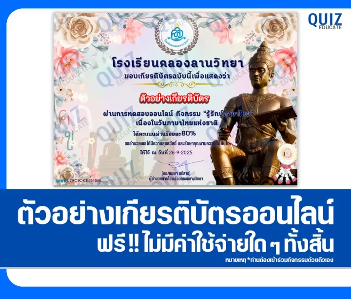 สวัสดีครับ วันนี้ผมขอนำกิจกรรมทำข้อสอบวัดระดับความรู้ เรื่อง รู้รักษ์ภาษาไทย เพื่อรับเกียรติบัตรออนไลน์ โดยเมื่อท่านได้ทำแบบทดสอบผ่านเกณฑ์ที่ทางผู้จัดกิจกรรมได้กำหนดไว้ ท่านจะได้รับเกียรติบัตรเป็นไฟล์ PDF ดังภาพตัวอย่างที่ได้ทางผมได้นำมาแสดงให้ดูไว้ผ่านทาง Email ที่ท่านได้ลงทะเบียนไว้ตอนทำแบบทดสอบ หรือ Platform ค้นหาเกียรติบัตร(จะมีปุ่มค้นหาอยู่ข้างๆกัน)ครับ สามารถทำแบบทดสอบได้ที่ปุ่มทำแบบทดสอบด้านล่างเลยครับ