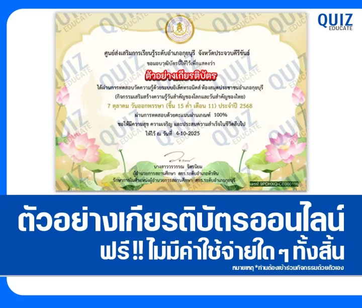 สวัสดีครับ วันนี้ผมขอนำกิจกรรมการทำข้อสอบวัดระดับความรู้ เรื่อง วันออกพรรษา 2568 เพื่อรับเกียรติบัตรออนไลน์ โดยเมื่อท่านได้ทำแบบทดสอบผ่านเกณฑ์ที่ทางผู้จัดกิจกรรมได้กำหนดไว้ ท่านจะได้รับเกียรติบัตรเป็นไฟล์ PDF ดังภาพตัวอย่างที่ได้ทางผมได้นำมาแสดงให้ดูไว้ผ่านทาง Platform ที่ท่านได้ลงทะเบียนไว้ตอนทำแบบทดสอบครับ สามารถทำแบบทดสอบได้ที่ปุ่มทำแบบทดสอบด้านล่างเลยครับ
