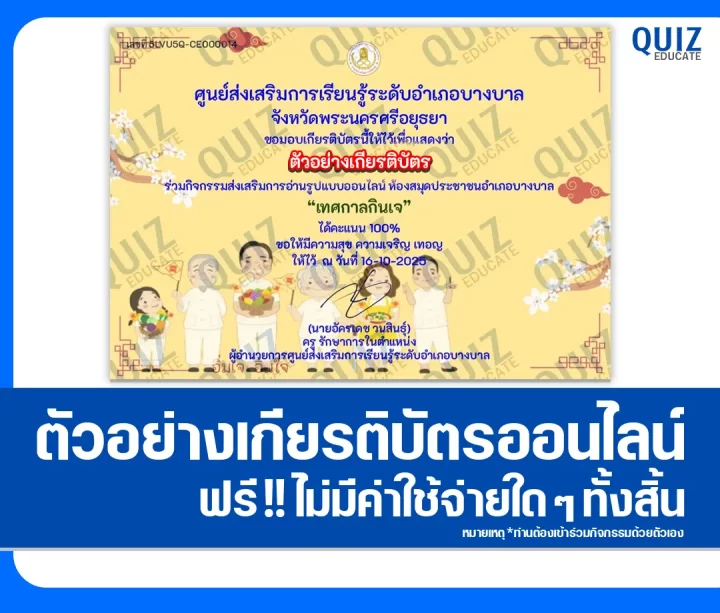 สวัสดีครับ วันนี้ผมขอนำกิจกรรมการทำข้อสอบวัดระดับความรู้ เรื่อง เทศกาลกินเจ เพื่อรับเกียรติบัตรออนไลน์ ผ่าน Google Form โดยเมื่อท่านได้ทำแบบทดสอบผ่านเกณฑ์ที่ทางผู้จัดกิจกรรมได้กำหนดไว้ ท่านจะได้รับเกียรติบัตรเป็นไฟล์ PDF ดังภาพตัวอย่างที่ได้ทางผมได้นำมาแสดงให้ดูไว้ผ่านทาง Email ที่ท่านได้ลงทะเบียนไว้ตอนทำแบบทดสอบ หรือ Platform ค้นหาเกียรติบัตร(จะมีปุ่มค้นหาให้ดาวน์โหลดอยู่ข้างๆกัน)ครับ สามารถทำแบบทดสอบได้ที่ลิงก์ทำแบบทดสอบด้านล่างเลยครับ