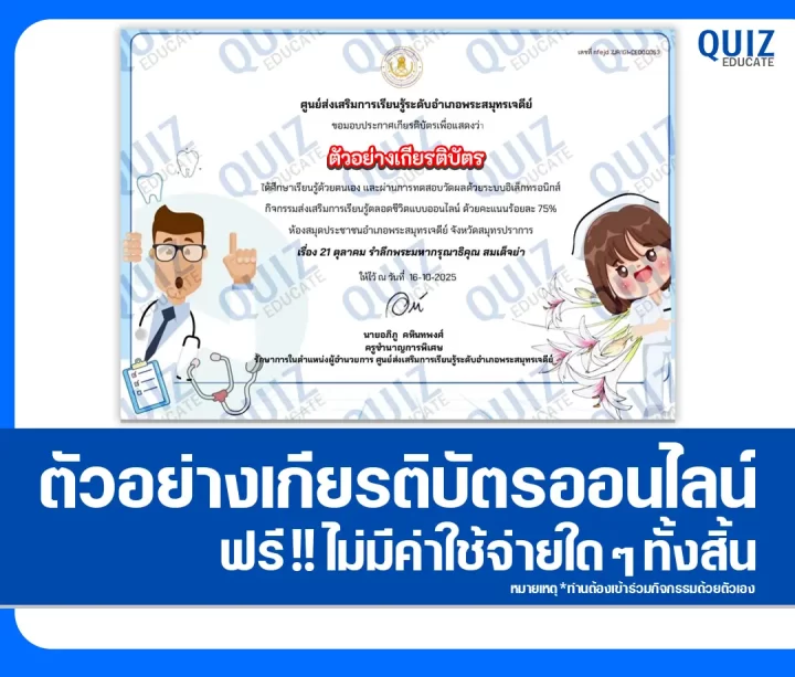 สวัสดีครับ วันนี้ผมขอนำกิจกรรมทำข้อสอบวัดระดับความรู้ เรื่อง 21 ตุลาคม รำลึกพระมหากรุณาธิคุณ สมเด็จย่า เพื่อรับเกียรติบัตรออนไลน์โดย สถาบันเสริมศึกษาและทรัพยากรมนุษย์ มหาวิทยาลัยธรรมศาสตร์ โดยเมื่อท่านได้ทำแบบทดสอบผ่านเกณฑ์ที่ทางผู้จัดกิจกรรมได้กำหนดไว้ ท่านจะได้รับเกียรติบัตรเป็นไฟล์ PDF ดังภาพตัวอย่างที่ได้ทางผมได้นำมาแสดงให้ดูไว้ผ่านทาง Email ที่ท่านได้ลงทะเบียนไว้ตอนทำแบบทดสอบ หรือ Platform ค้นหาเกียรติบัตร(จะมีปุ่มค้นหาอยู่ข้างๆกัน)ครับ สามารถทำแบบทดสอบได้ที่ปุ่มทำแบบทดสอบด้านล่างเลยครับ
