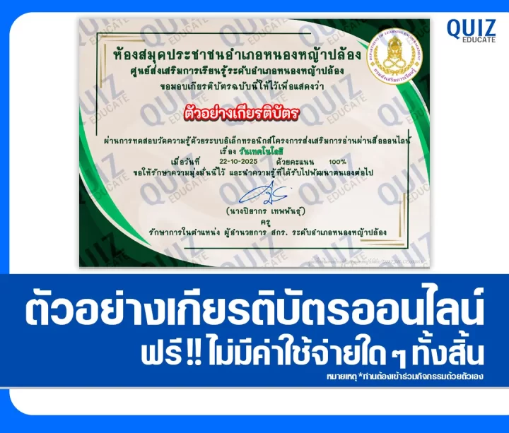 ทำข้อสอบวัดระดับความรู้ เรื่อง วันเทคโนโลยีของไทย เพื่อรับเกียรติบัตรออนไลน์ ผ่าน Google form จาก ห้องสมุดประชาชนอำเภอหนองหญ้าปล้อง