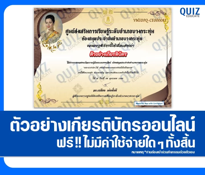 สวัสดีครับ วันนี้ผมขอนำกิจกรรมทำข้อสอบวัดระดับความรู้ เรื่อง พระราชกรณียกิจ พระบรมราชชนนีพันปีหลวง เพื่อรับเกียรติบัตรออนไลน์ จากห้องสมุดประชาชนอำเภอบางกระทุ่ม โดยเมื่อท่านได้ทำแบบทดสอบผ่านเกณฑ์ที่ทางผู้จัดกิจกรรมได้กำหนดไว้ ท่านจะได้รับเกียรติบัตรเป็นไฟล์ PDF ดังภาพตัวอย่างที่ได้ทางผมได้นำมาแสดงให้ดูไว้ผ่านทาง Email ที่ท่านได้ลงทะเบียนไว้ตอนทำแบบทดสอบ หรือ Platform ค้นหาเกียรติบัตร(จะมีปุ่มค้นหาอยู่ข้างๆกัน)ครับ สามารถทำแบบทดสอบได้ที่ปุ่มทำแบบทดสอบด้านล่างเลยครับ