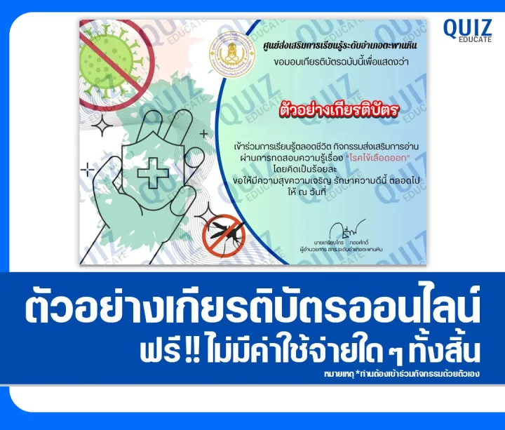 สวัสดีครับ วันนี้ผมขอนำกิจกรรมการทำข้อสอบวัดระดับความรู้ เรื่อง โรคไข้เลือดออก เพื่อรับเกียรติบัตรออนไลน์ ผ่าน Google Form โดยเมื่อท่านได้ทำแบบทดสอบผ่านเกณฑ์ที่ทางผู้จัดกิจกรรมได้กำหนดไว้ ท่านจะได้รับเกียรติบัตรเป็นไฟล์ PDF ดังภาพตัวอย่างที่ได้ทางผมได้นำมาแสดงให้ดูไว้ผ่านทาง Email ที่ท่านได้ลงทะเบียนไว้ตอนทำแบบทดสอบ หรือ Platform ค้นหาเกียรติบัตร(จะมีปุ่มค้นหาอยู่ข้างๆกัน)ครับ สามารถทำแบบทดสอบได้ที่ปุ่มทำแบบทดสอบด้านล่างเลยครับ
