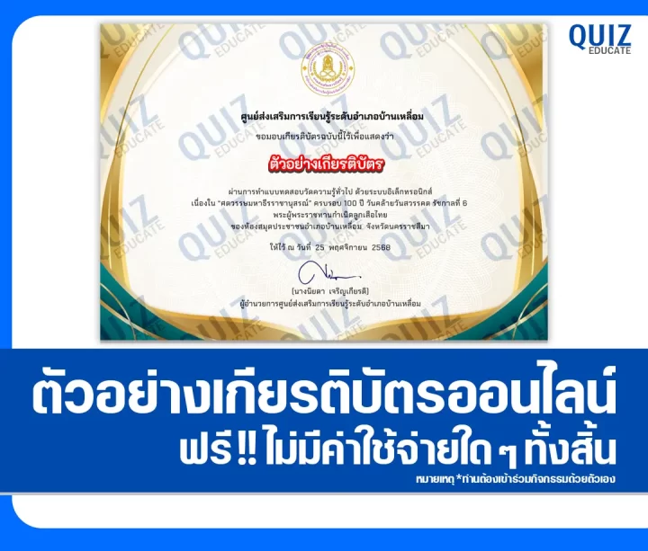 สวัสดีครับ วันนี้ผมขอนำกิจกรรมการทำข้อสอบวัดระดับความรู้ เรื่อง ศตวรรษมหาธีรราชานุสรณ์ ครบรอบ 100 ปี วันคล้ายวันสวรรคต รัชกาลที่ 6 พระผู้พระราชทานกำเนิดลูกเสือไทย เพื่อรับเกียรติบัตรออนไลน์ ผ่าน Google Form โดยเมื่อท่านได้ทำแบบทดสอบผ่านเกณฑ์ที่ทางผู้จัดกิจกรรมได้กำหนดไว้ ท่านจะได้รับเกียรติบัตรเป็นไฟล์ PDF ดังภาพตัวอย่างที่ได้ทางผมได้นำมาแสดงให้ดูไว้ผ่านทาง Email ที่ท่านได้ลงทะเบียนไว้ตอนทำแบบทดสอบครับ สามารถทำแบบทดสอบได้ที่ปุ่มทำแบบทดสอบด้านล่างเลยครับ