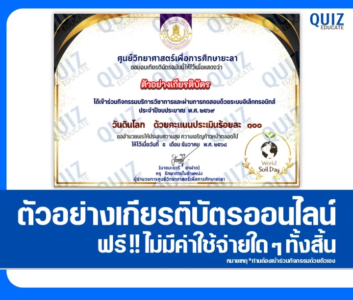 สวัสดีครับ วันนี้ผมขอนำกิจกรรมการทำข้อสอบวัดระดับความรู้ เรื่อง วันดินโลก 2569 เพื่อรับเกียรติบัตรออนไลน์ ผ่าน Google Form โดยเมื่อท่านได้ทำแบบทดสอบผ่านเกณฑ์ที่ทางผู้จัดกิจกรรมได้กำหนดไว้ ท่านจะได้รับเกียรติบัตรเป็นไฟล์ PDF ดังภาพตัวอย่างที่ได้ทางผมได้นำมาแสดงให้ดูไว้ผ่านทาง Email หรือ Platform ที่ท่านได้ลงทะเบียนไว้ตอนทำแบบทดสอบครับ สามารถทำแบบทดสอบได้ที่ปุ่มทำแบบทดสอบด้านล่างเลยครับ
