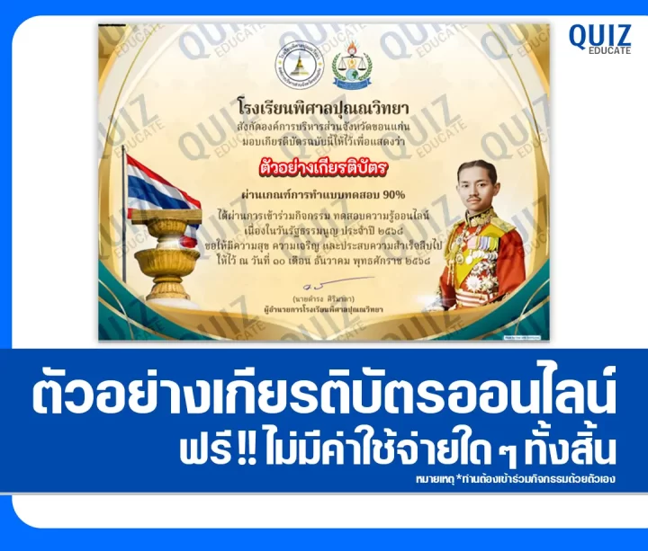 สวัสดีครับ วันนี้ผมขอนำกิจกรรมทำข้อสอบวัดระดับความรู้ เรื่อง วันรัฐธรรมนูญ เพื่อรับเกียรติบัตรออนไลน์โดย สถาบันเสริมศึกษาและทรัพยากรมนุษย์ มหาวิทยาลัยธรรมศาสตร์ โดยเมื่อท่านได้ทำแบบทดสอบผ่านเกณฑ์ที่ทางผู้จัดกิจกรรมได้กำหนดไว้ ท่านจะได้รับเกียรติบัตรเป็นไฟล์ PDF ดังภาพตัวอย่างที่ได้ทางผมได้นำมาแสดงให้ดูไว้ผ่านทาง Email ที่ท่านได้ลงทะเบียนไว้ตอนทำแบบทดสอบ หรือ Platform ค้นหาเกียรติบัตร(จะมีปุ่มค้นหาอยู่ข้างๆกัน)ครับ สามารถทำแบบทดสอบได้ที่ปุ่มทำแบบทดสอบด้านล่างเลยครับ