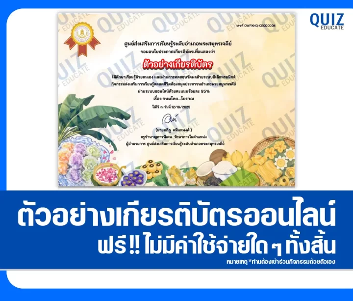 สวัสดีครับ วันนี้ผมขอนำกิจกรรมการทำข้อสอบวัดระดับความรู้ เรื่อง ขนมไทย โบราณ เพื่อรับเกียรติบัตรออนไลน์ ผ่าน Google Form โดยเมื่อท่านได้ทำแบบทดสอบผ่านเกณฑ์ที่ทางผู้จัดกิจกรรมได้กำหนดไว้ ท่านจะได้รับเกียรติบัตรเป็นไฟล์ PDF ดังภาพตัวอย่างที่ได้ทางผมได้นำมาแสดงให้ดูไว้ผ่านทาง Email ที่ท่านได้ลงทะเบียนไว้ตอนทำแบบทดสอบ หรือ Platform ค้นหาเกียรติบัตร(จะมีปุ่มค้นหาอยู่ข้างๆกัน)ครับ สามารถทำแบบทดสอบได้ที่ปุ่มทำแบบทดสอบด้านล่างเลยครับ