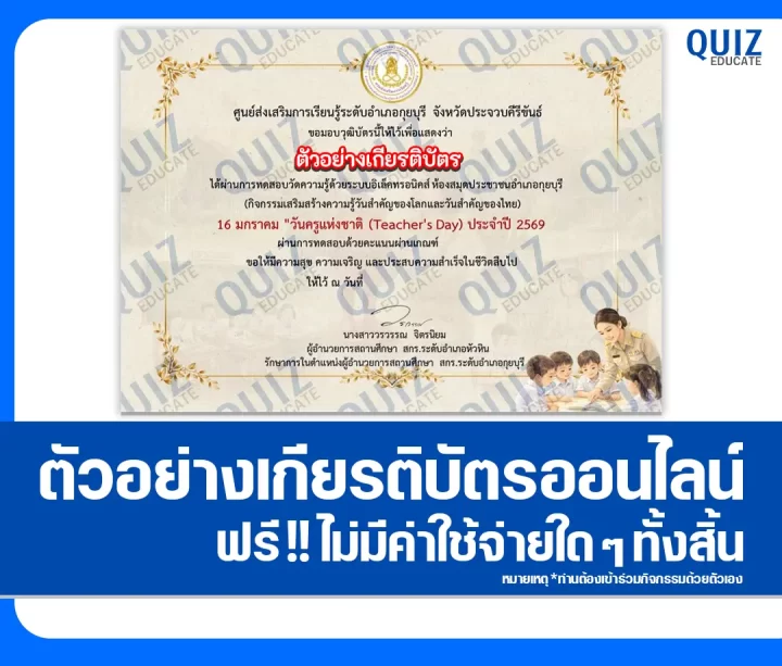 สวัสดีครับ วันนี้ผมขอนำกิจกรรมการทำข้อสอบวัดระดับความรู้ เรื่อง วันครูแห่งชาติ Teacher’s Day เพื่อรับเกียรติบัตรออนไลน์ ผ่าน Google form โดยเมื่อท่านได้ทำแบบทดสอบผ่านเกณฑ์ที่ทางผู้จัดกิจกรรมได้กำหนดไว้ ท่านจะได้รับเกียรติบัตรเป็นไฟล์ PDF ดังภาพตัวอย่างที่ได้ทางผมได้นำมาแสดงให้ดูไว้ผ่านทาง Email ที่ท่านได้ลงทะเบียนไว้ตอนทำแบบทดสอบครับ สามารถทำแบบทดสอบได้ที่ปุ่มทำแบบทดสอบด้านล่างเลยครับ