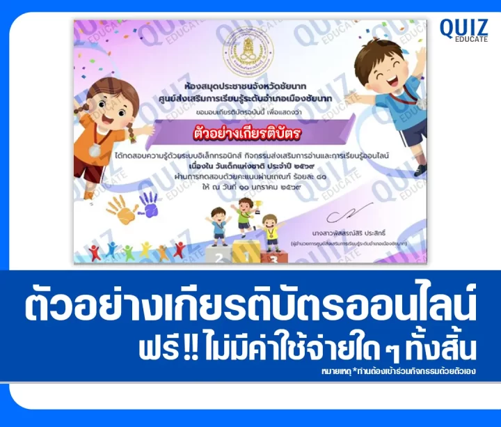 สวัสดีครับ วันนี้พี่แอดมินขอนำกิจกรรมการทำข้อสอบวัดระดับความรู้ เรื่อง วันเด็กแห่งชาติ ประจำปี 2569 เพื่อรับเกียรติบัตรออนไลน์ ผ่าน Google Form โดยเมื่อท่านได้ทำแบบทดสอบผ่านเกณฑ์ที่ทางผู้จัดกิจกรรมได้กำหนดไว้ ท่านจะได้รับเกียรติบัตรเป็นไฟล์ PDF ดังภาพตัวอย่างที่ได้ทางผมได้นำมาแสดงให้ดูไว้ผ่านทาง Email ที่ท่านได้ลงทะเบียนไว้ตอนทำแบบทดสอบครับ สามารถทำแบบทดสอบได้ที่ปุ่มทำแบบทดสอบด้านล่างเลยครับ