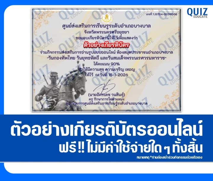 สวัสดีครับ วันนี้ผมขอนำกิจกรรมทำข้อสอบวัดระดับความรู้ เรื่อง วันกองทัพไทย วันยุทธหัตถี และวันสมเด็จพระนเรศวรมหาราช เพื่อรับเกียรติบัตรออนไลน์โดย สถาบันเสริมศึกษาและทรัพยากรมนุษย์ มหาวิทยาลัยธรรมศาสตร์ โดยเมื่อท่านได้ทำแบบทดสอบผ่านเกณฑ์ที่ทางผู้จัดกิจกรรมได้กำหนดไว้ ท่านจะได้รับเกียรติบัตรเป็นไฟล์ PDF ดังภาพตัวอย่างที่ได้ทางผมได้นำมาแสดงให้ดูไว้ผ่านทาง Email ที่ท่านได้ลงทะเบียนไว้ตอนทำแบบทดสอบ หรือ Platform ค้นหาเกียรติบัตร(จะมีปุ่มค้นหาอยู่ข้างๆกัน)ครับ สามารถทำแบบทดสอบได้ที่ปุ่มทำแบบทดสอบด้านล่างเลยครับ