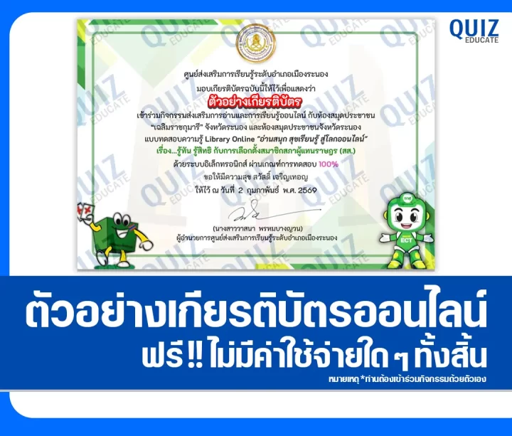 ทำข้อสอบวัดระดับความรู้ เรื่อง รู้ทัน รู้สิทธิ กับการเลือกตั้งสมาชิกสภาผู้แทนราษฎร (สส.) เพื่อรับเกียรติบัตรออนไลน์
