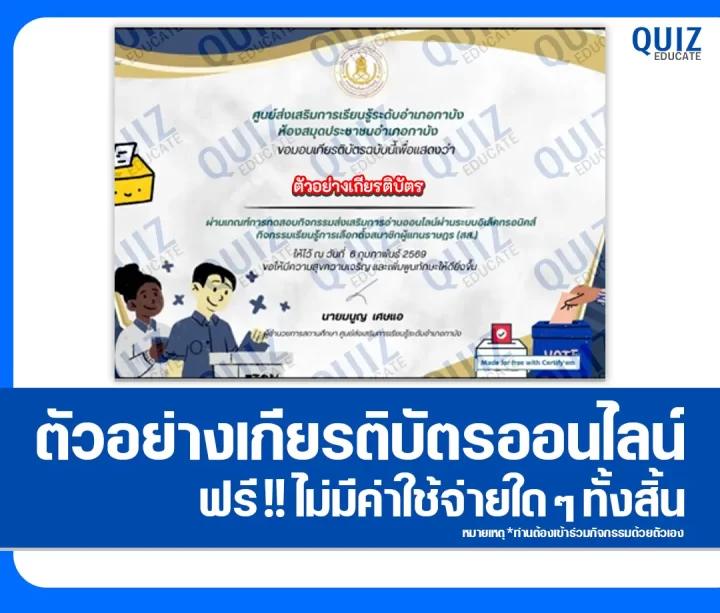 QUIZEDUCATE > เกียรติบัตรออนไลน์ > สังคมศึกษา > เกียรติบัตรออนไลน์ฟรี ทำข้อสอบวัดระดับความรู้ เรื่อง การเลือกตั้งสมาชิกผู้แทนราษฎร 2569
