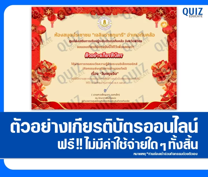 สวัสดีครับ วันนี้ผมขอนำกิจกรรมการทำข้อสอบวัดระดับความรู้ เรื่อง วันตรุษจีน Chinese New Year เพื่อรับเกียรติบัตรออนไลน์ ผ่าน Google Form โดยเมื่อท่านได้ทำแบบทดสอบผ่านเกณฑ์ที่ทางผู้จัดกิจกรรมได้กำหนดไว้ ท่านจะได้รับเกียรติบัตรเป็นไฟล์ PDF ดังภาพตัวอย่างที่ได้ทางผมได้นำมาแสดงให้ดูไว้ผ่านทาง Email ที่ท่านได้ลงทะเบียนไว้ตอนทำแบบทดสอบ หรือ Platform ค้นหาเกียรติบัตร(จะมีปุ่มค้นหาให้ดาวน์โหลดอยู่ข้างๆกัน)ครับ สามารถทำแบบทดสอบได้ที่ลิงก์ทำแบบทดสอบด้านล่างเลยครับ