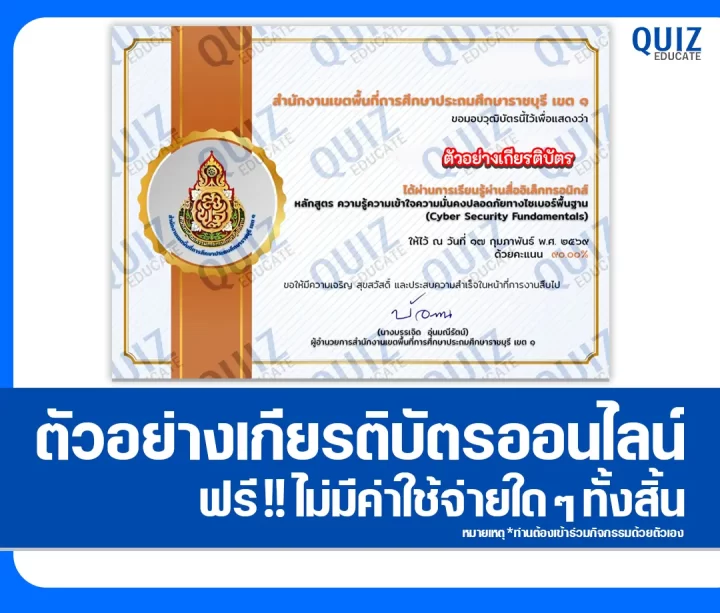 เกียรติบัตรออนไลน์ฟรี ทำข้อสอบวัดระดับความรู้ เรื่อง ความมั่นคงปลอดภัยทางไซเบอร์ขั้นพื้นฐาน Cyber Security 2026