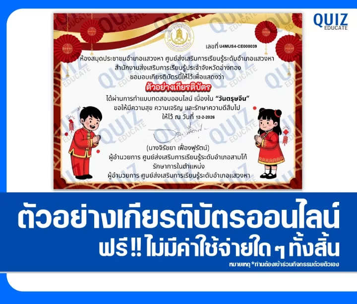 เกียรติบัตรออนไลน์ฟรี ทำข้อสอบวัดระดับความรู้ เรื่อง วันตรุษจีน Chinese New Year 2026