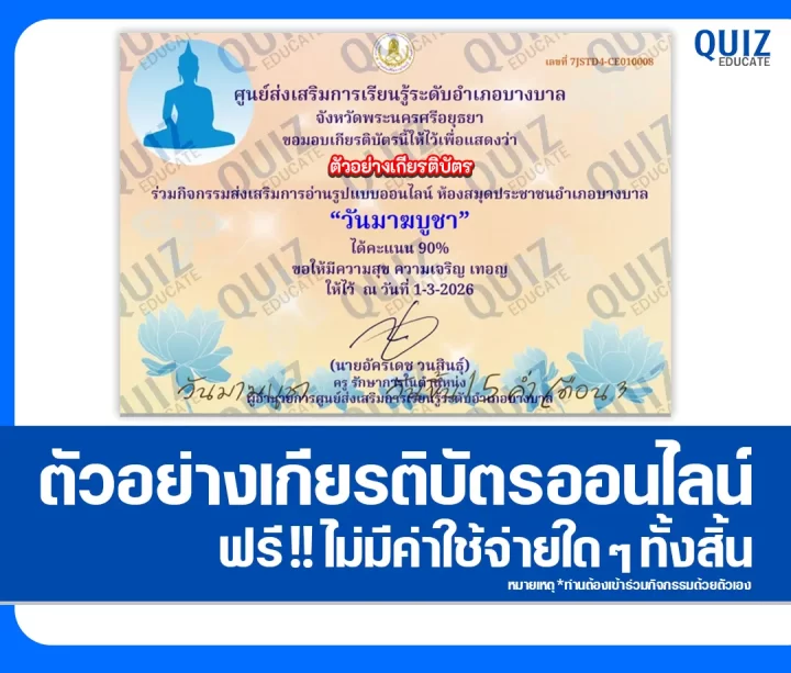 เกียรติบัตรออนไลน์ฟรี ทำข้อสอบวัดระดับความรู้ เรื่อง วันมาฆบูชา 2026