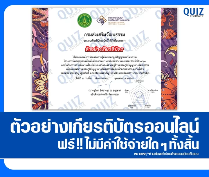 ทำข้อสอบวัดระดับความรู้ เรื่อง ความรู้ด้านมรดกภูมิปัญญาทางวัฒนธรรม เพื่อรับเกียรติบัตรออนไลน์ ผ่าน learning.culture.go.th จาก กรมส่งเสริมวัฒนธรรม