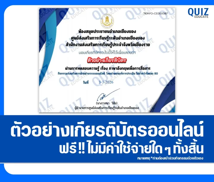 สวัสดีครับ วันนี้ผมขอนำกิจกรรมการทำข้อสอบวัดระดับความรู้ เรื่อง ภาษาอังกฤษเพื่อการสื่อสาร เพื่อรับเกียรติบัตรออนไลน์ ผ่าน Google form โดยเมื่อท่านได้ทำแบบทดสอบผ่านเกณฑ์ที่ทางผู้จัดกิจกรรมได้กำหนดไว้ ท่านจะได้รับเกียรติบัตรเป็นไฟล์ PDF ดังภาพตัวอย่างที่ได้ทางผมได้นำมาแสดงให้ดูไว้ผ่านทาง Email หรือ Platform ที่ท่านได้ลงทะเบียนไว้ตอนทำแบบทดสอบครับ สามารถทำแบบทดสอบได้ที่ปุ่มทำแบบทดสอบด้านล่างเลยครับ
