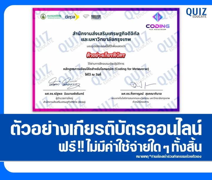 สวัสดีครับ วันนี้ผมขอนำกิจกรรมการกิจกรรมอบรมออนไลน์ เรื่อง ความรู้พื้นฐานด้านการสร้างโลกเมตาเวิร์ส Fundamental Knowledge of Metaverse Creating เพื่อรับเกียรติบัตรออนไลน์ จาก จาก มหาวิทยาลัยกรุงเทพและ DEPA โดยเมื่อท่านได้ทำแบบทดสอบผ่านเกณฑ์ที่ทางผู้จัดกิจกรรมได้กำหนดไว้ ท่านจะได้รับเกียรติบัตรเป็นไฟล์ PDF ดังภาพตัวอย่างที่ได้ทางผมได้นำมาแสดงให้ดูไว้ผ่านทาง Platform ที่ท่านได้ลงทะเบียนไว้ตอนทำแบบทดสอบครับ สามารถทำแบบทดสอบได้ที่ปุ่มทำแบบทดสอบด้านล่างเลยครับ