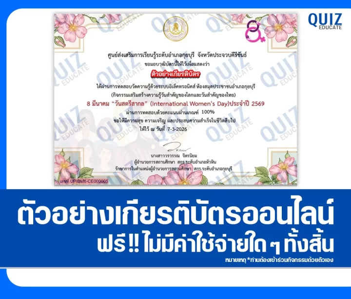 สวัสดีครับ วันนี้ผมขอนำกิจกรรมการทำข้อสอบวัดระดับความรู้ เรื่อง วันสตรีสากล International Women’s Day เพื่อรับเกียรติบัตรออนไลน์ ผ่าน Google Form โดยเมื่อท่านได้ทำแบบทดสอบผ่านเกณฑ์ที่ทางผู้จัดกิจกรรมได้กำหนดไว้ ท่านจะได้รับเกียรติบัตรเป็นไฟล์ PDF ดังภาพตัวอย่างที่ได้ทางผมได้นำมาแสดงให้ดูไว้ผ่านทาง Email ที่ท่านได้ลงทะเบียนไว้ตอนทำแบบทดสอบ หรือ Platform ค้นหาเกียรติบัตร(จะมีปุ่มค้นหาอยู่ข้างๆกัน)ครับ สามารถทำแบบทดสอบได้ที่ปุ่มทำแบบทดสอบด้านล่างเลยครับ