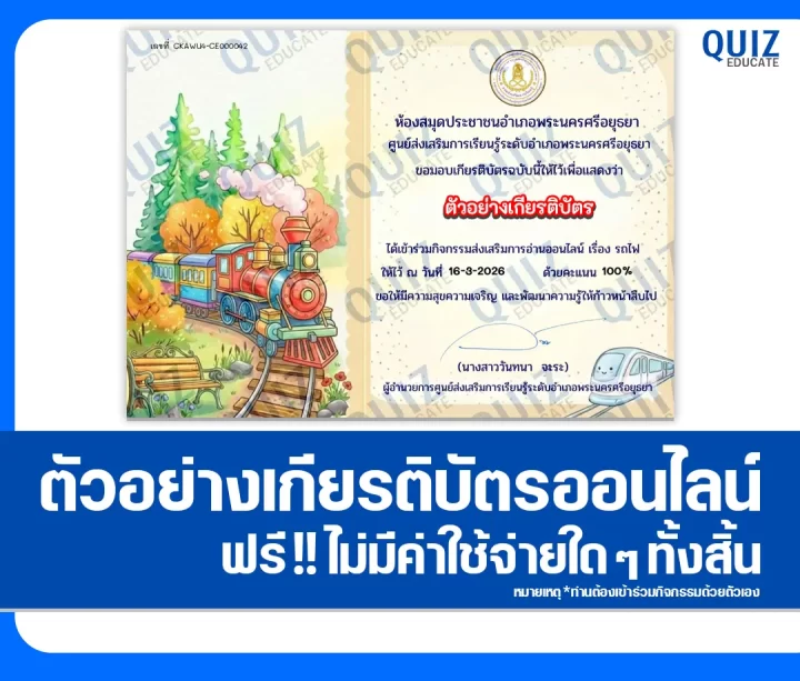 สวัสดีครับ วันนี้พี่แอดมินขอนำกิจกรรมการทำข้อสอบวัดระดับความรู้ เรื่อง รถไฟ เพื่อรับเกียรติบัตรออนไลน์ ผ่าน Google form โดยเมื่อท่านได้ทำแบบทดสอบผ่านเกณฑ์ที่ทางผู้จัดกิจกรรมได้กำหนดไว้ ท่านจะได้รับเกียรติบัตรเป็นไฟล์ PDF ดังภาพตัวอย่างที่ได้ทางผมได้นำมาแสดงให้ดูไว้ผ่านทาง Email ที่ท่านได้ลงทะเบียนไว้ตอนทำแบบทดสอบครับ สามารถทำแบบทดสอบได้ที่ปุ่มทำแบบทดสอบด้านล่างเลยครับ