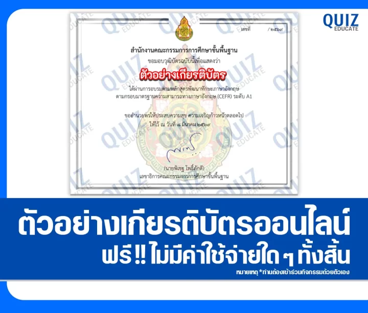 สวัสดีครับ วันนี้ผมขอนำกิจกรรมการทำข้อสอบวัดระดับความรู้ เรื่อง หลักสูตรพัฒนาทักษะภาษาอังกฤษ A1 – B2 ตามกรอบมาตรฐานความสามารถทาง ภาษาอังกฤษ (CEFR) เพื่อรับเกียรติบัตรออนไลน์ จาก สพฐ. โดยเมื่อท่านได้ทำแบบทดสอบผ่านเกณฑ์ที่ทางผู้จัดกิจกรรมได้กำหนดไว้ ท่านจะได้รับเกียรติบัตรเป็นไฟล์ PDF ดังภาพตัวอย่างที่ได้ทางผมได้นำมาแสดงให้ดูไว้ผ่านทาง Email หรือ Platform ที่ท่านได้ลงทะเบียนไว้ตอนทำแบบทดสอบครับ สามารถทำแบบทดสอบได้ที่ปุ่มทำแบบทดสอบด้านล่างเลยครับ