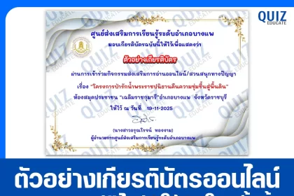 เกียรติบัตรออนไลน์ฟรี ทำข้อสอบวัดระดับความรู้ เรื่อง โครงการป่ารักน้ำ พระราชปณิธานคืนความชุ่มชื้นสู่ผืนดิน
